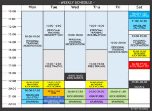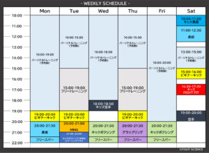・火曜19-20時のビギナーキックが復活。MMAクラスと連続する為、やや軽めの内容にします。そしてMMAクラスが20-21時に。